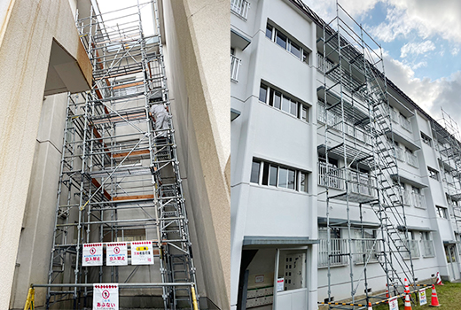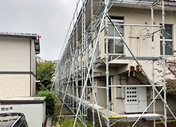 外壁塗装や屋根の部分的な補修工事など、一時的な目的のために設置する仮設足場。工事が終われば撤去するため、多くの場合は解体もスムーズなくさび式足場などの工法が採用されています。